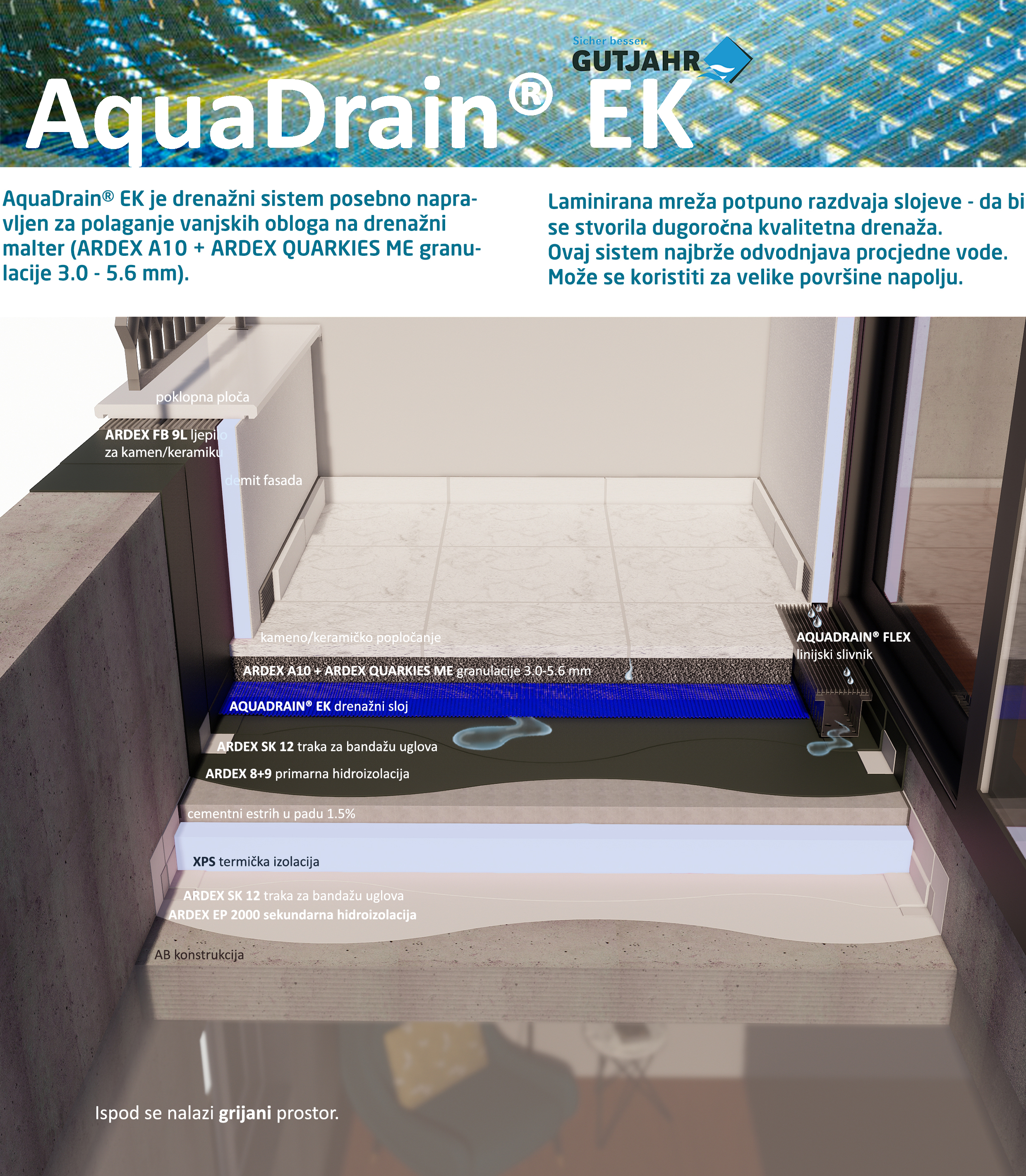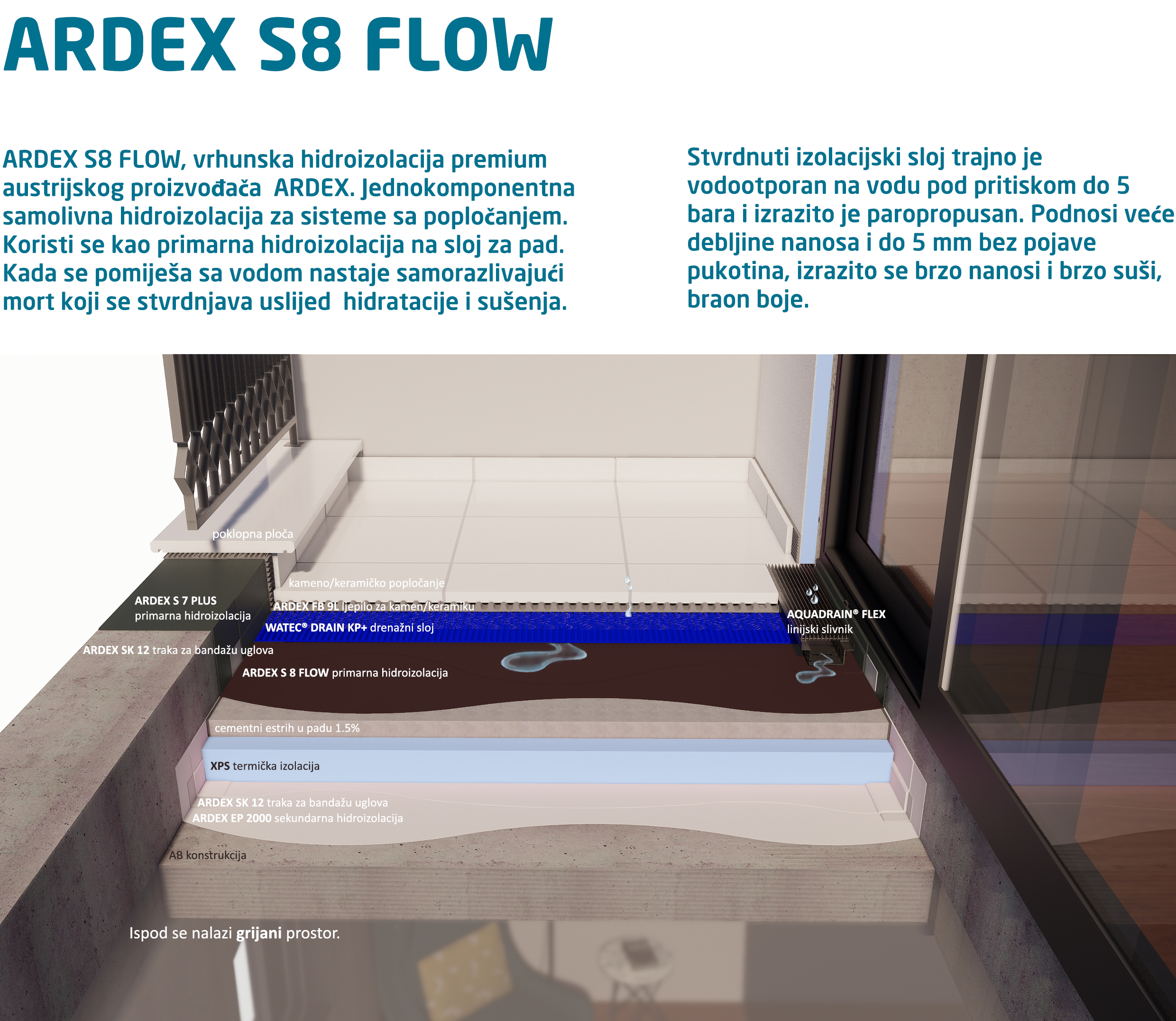 U download zoni možete pronaći detaljniji opis proizvoda ARDEX 8+9, ARDEX S7 PLUS, ARDEX S8 FLOW, WATEC® DRAIN KP+, AQUADRAIN® EP, AQUADRAIN® FLEX, kao i tehnički list proizvoda ARDEX EP 2000 na engleskom jeziku.