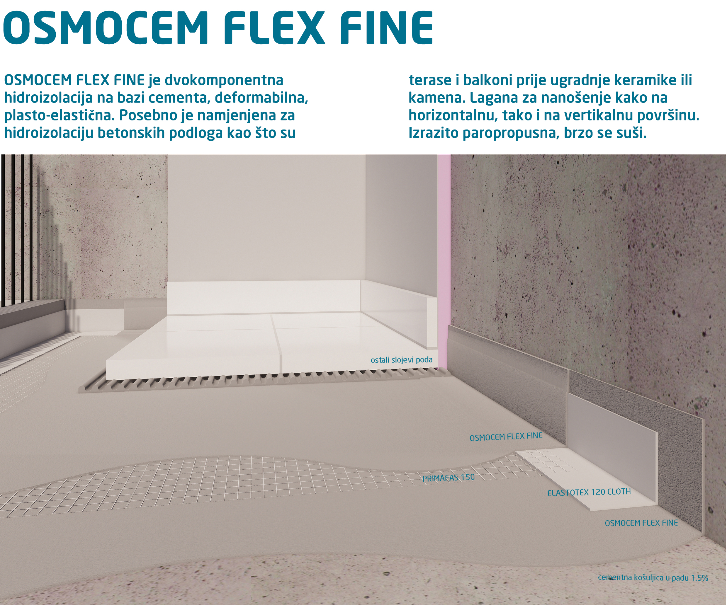 Azichem je italijanski proizvođač hidroizolacija. Njihov sistem za balkone čine proizvodi Osmocem Flex Fine i traka Elastotex 120 Cloth koja služi za bandažu uglova.