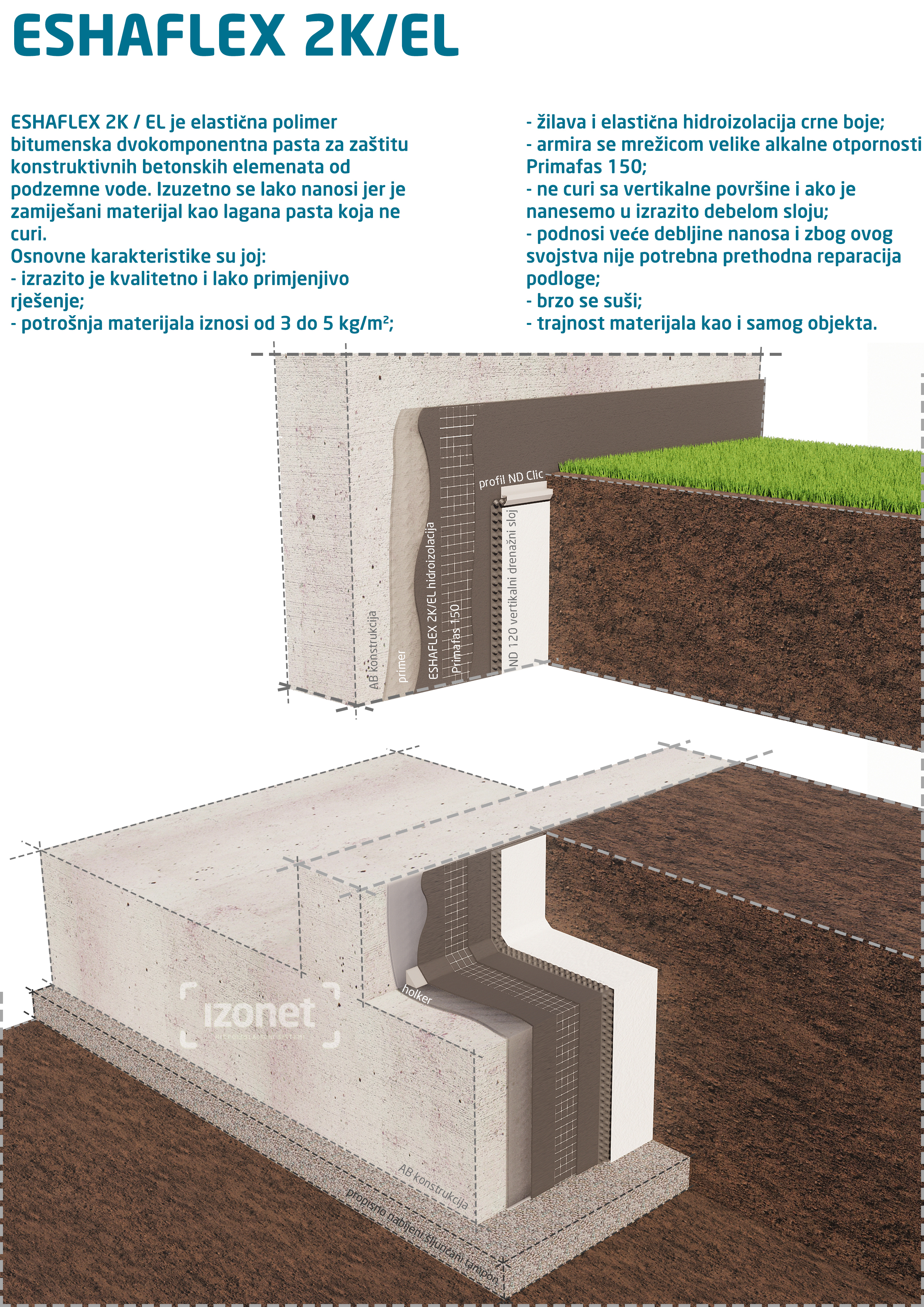 Esha je grčki proizvođač hidroizolacija. Njihov sistem za hidroizolaciju temelja čini više proizvoda a to su: primer od Eshaflex 2K/El-a i vode, Eshaflex 2K/El u dva sloja i mrežica velike alkalne otpornosti Primafas 150, koja služi za dodatno armiranje hidroizolacije.