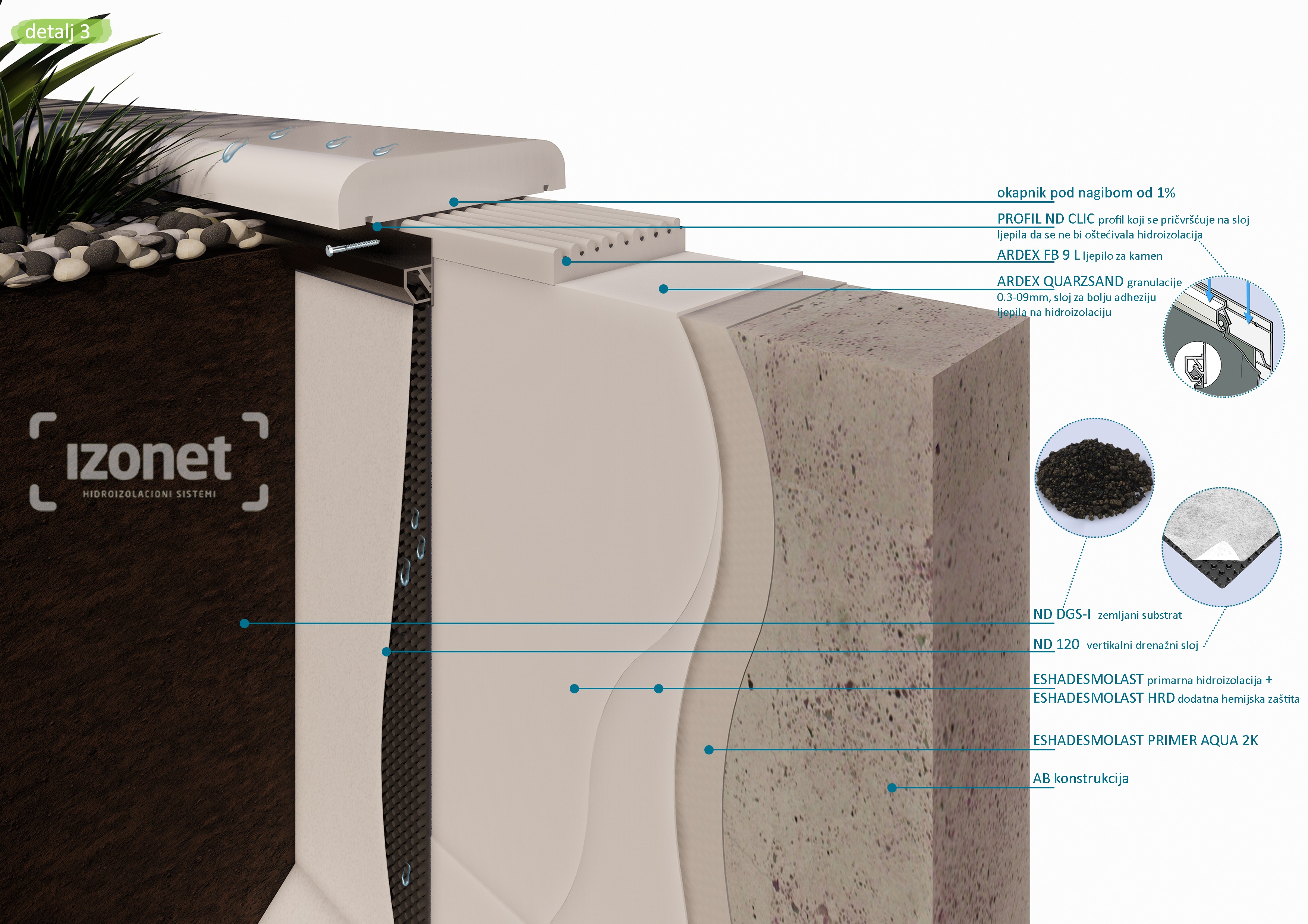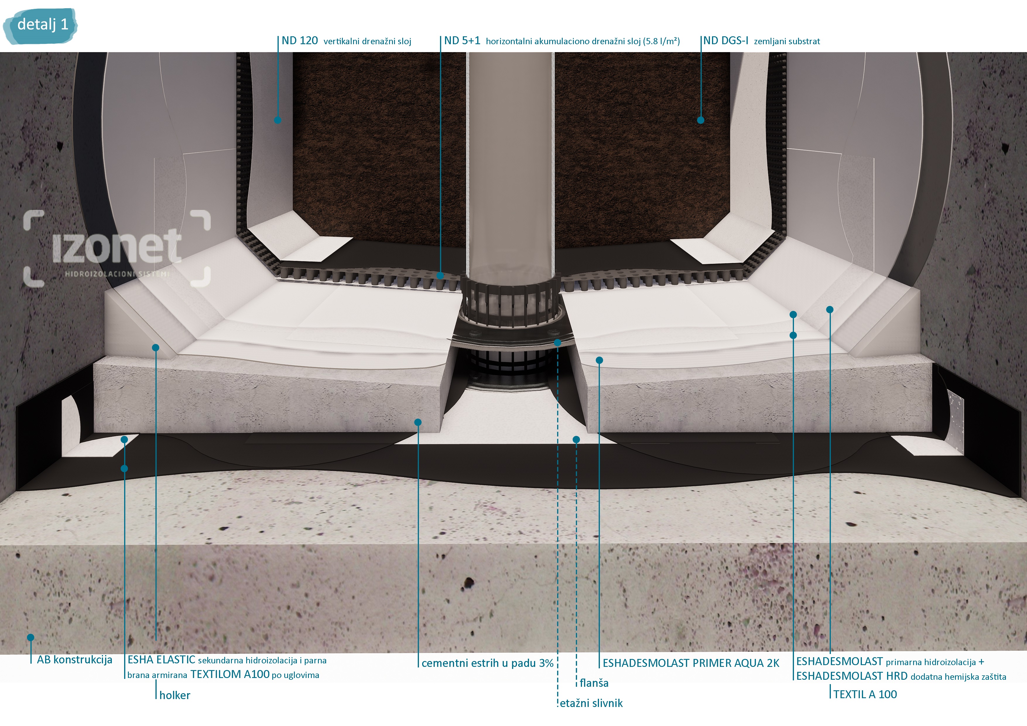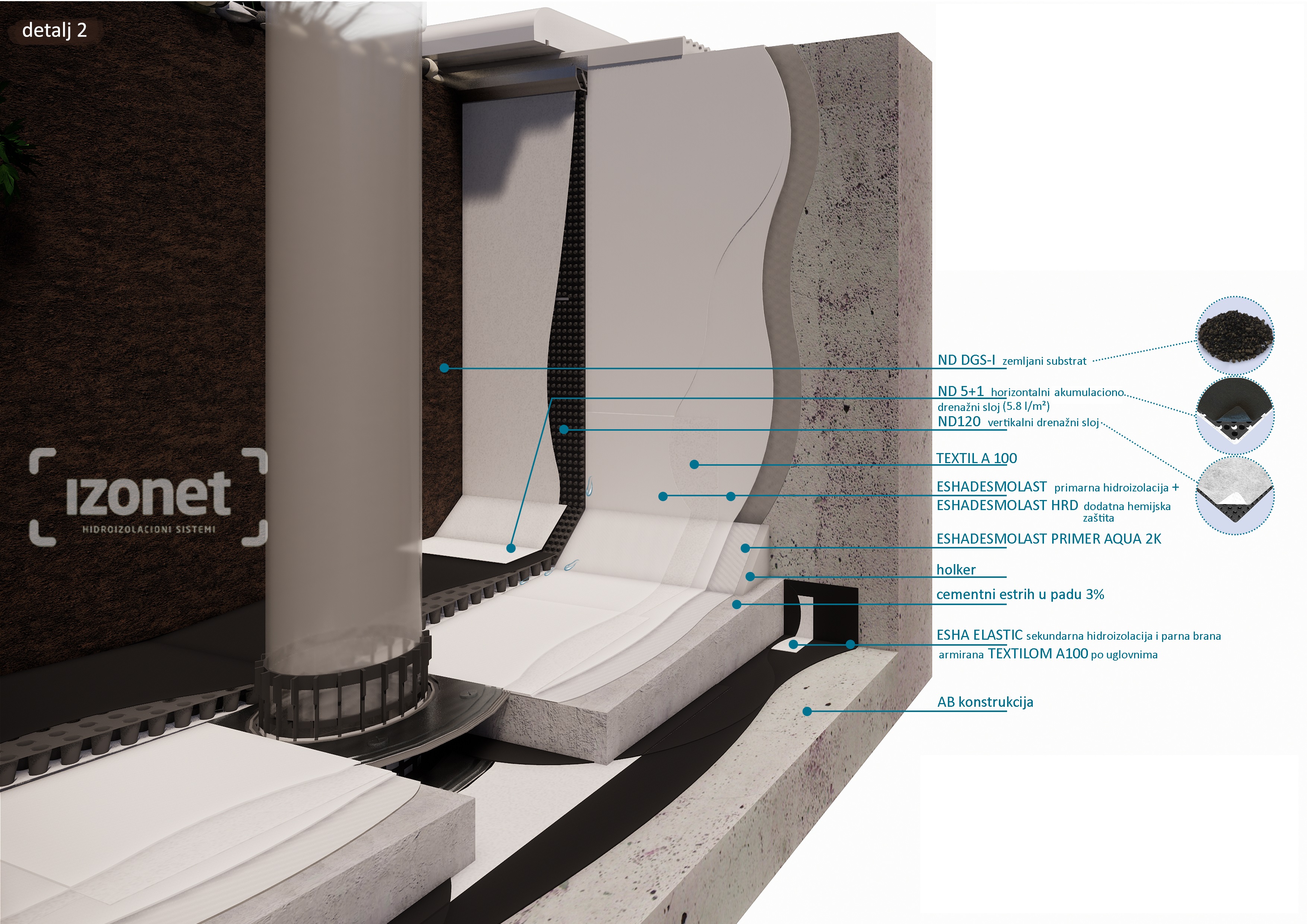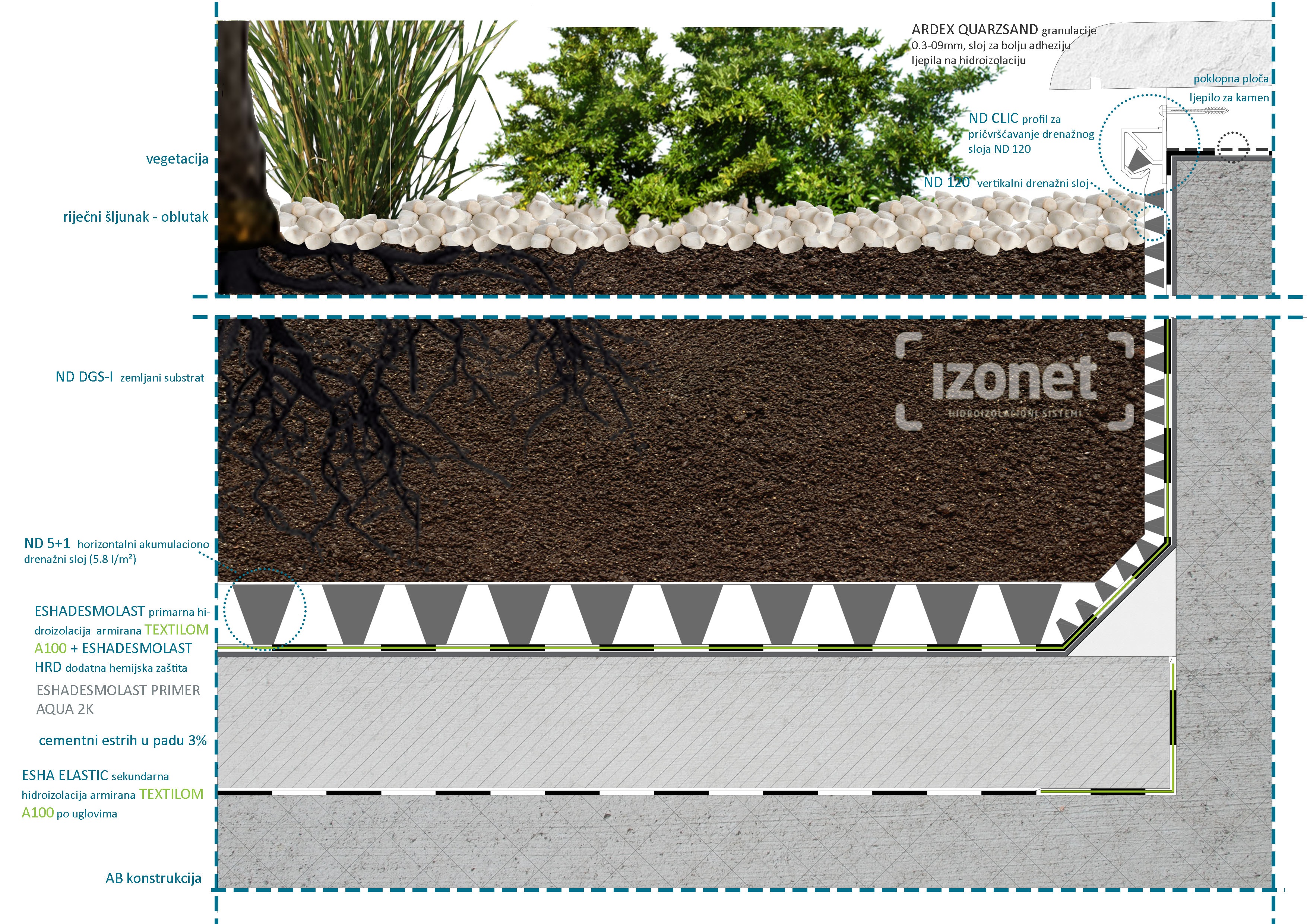 • Hidroizolacioni sistem intenzivnog zelenog krova – žardinjere. Ovaj sloj predstavlja najbitniji dio cjelokupnog sistema te se negativne posljedice loše izvedenog i loše konstruisanog hidroizolacionog sistema mogu u ovom slučaju smatrati jednom od najvećih grešaka prilikom gradnje objekta sa velikim negativnim posljedicama.