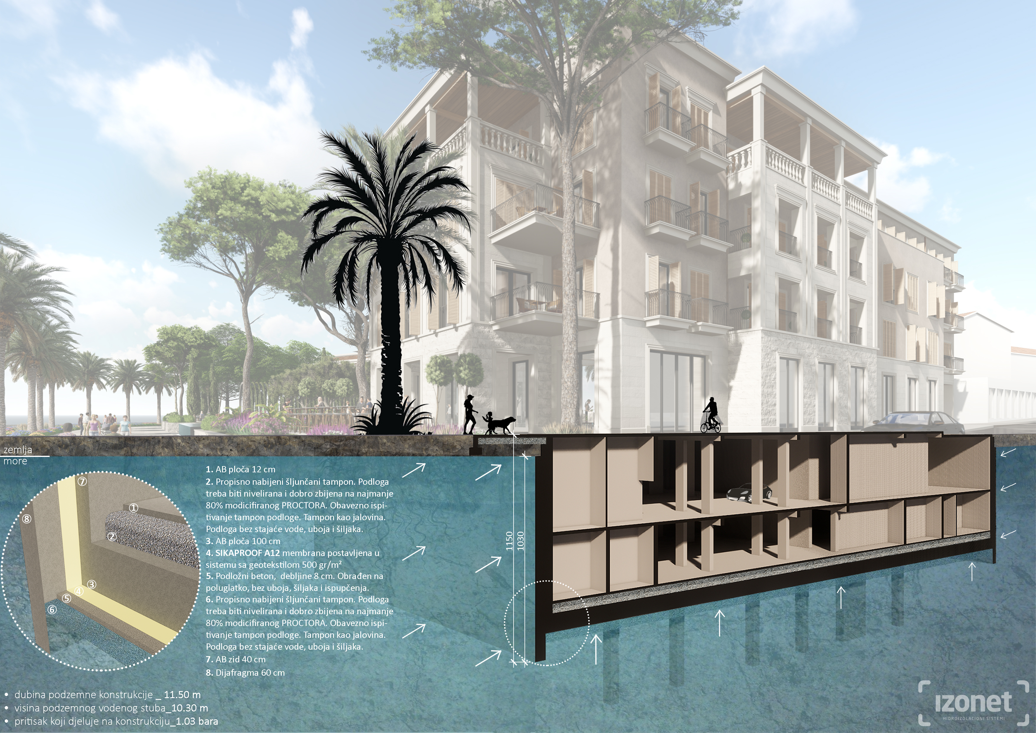 Izraziti pritisak morske vode po cijeloj dubini podzemnog dijela objekta, horizontalno i vertikalno, sve to u kombinaciji sa „Top down“ metodom gradnje (odozgo prema dolje), opravdava kategoriju jednog od građevinski i hidroizolaterski najzahtijevnijih i najodgovornijih projekata ne samo sa aspekta naše kompanije već i na nivou građevinskog sektora Crne Gore.