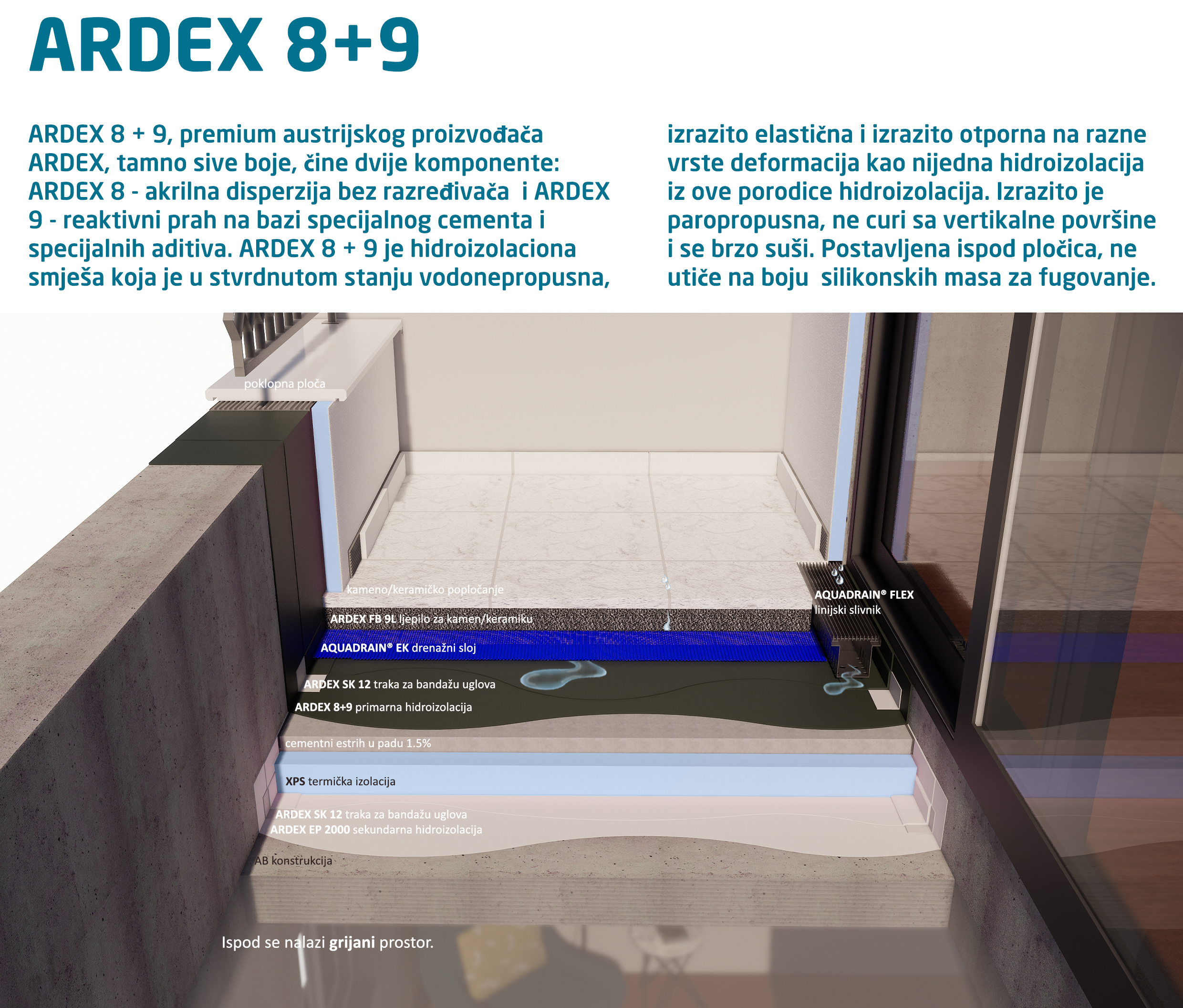 U download zoni možete pronaći detaljniji opis proizvoda ARDEX 8+9, ARDEX S7 PLUS, ARDEX S8 FLOW, WATEC® DRAIN KP+, AQUADRAIN® EP, AQUADRAIN® FLEX, kao i tehnički list proizvoda ARDEX EP 2000 na engleskom jeziku.