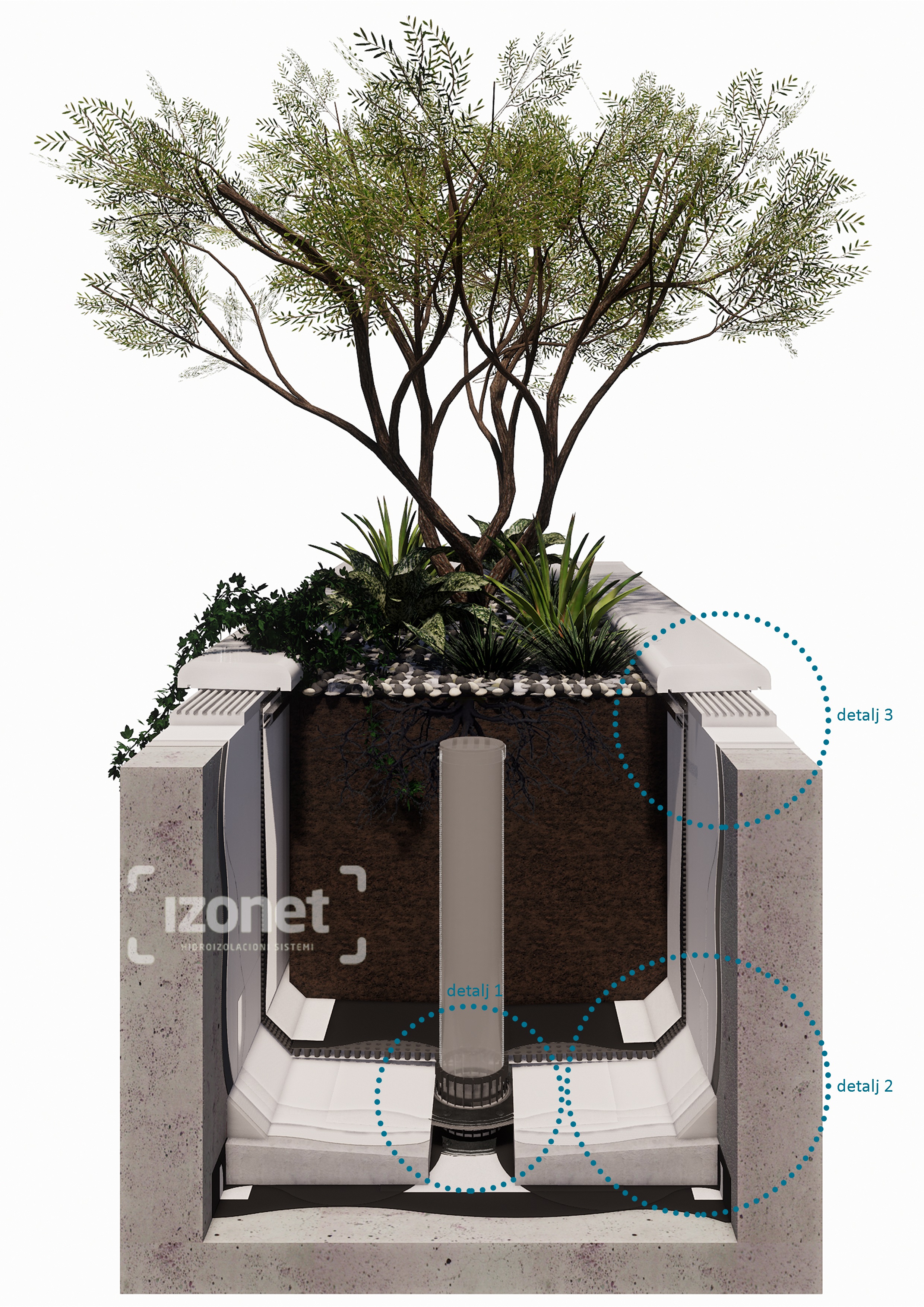 • Ovdje ćemo obraditi jedan tip duboke žardinjere sa svim tehničkim pojedinostima koja po svom konstruktivnom i sadržajnom smislu spada u red intenzivnih ili masivnih zelenih krovova. Takve žardinjere su pogodne za sadnju kako grmolikih biljaka i cvijeća, tako i stabala.